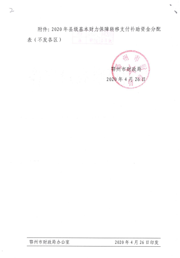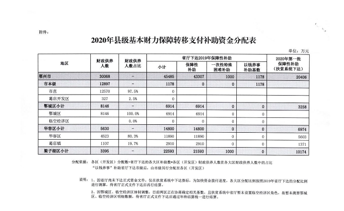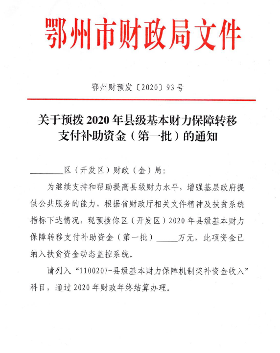 关于预拨2020年县级基本财力保障转移支付补助资金(第一批)的通知(鄂州财预发[2020]93号)
