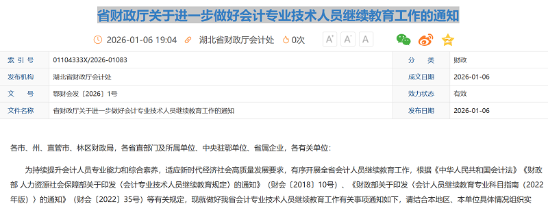 省财政厅发布通知,要求会计人员继续学习