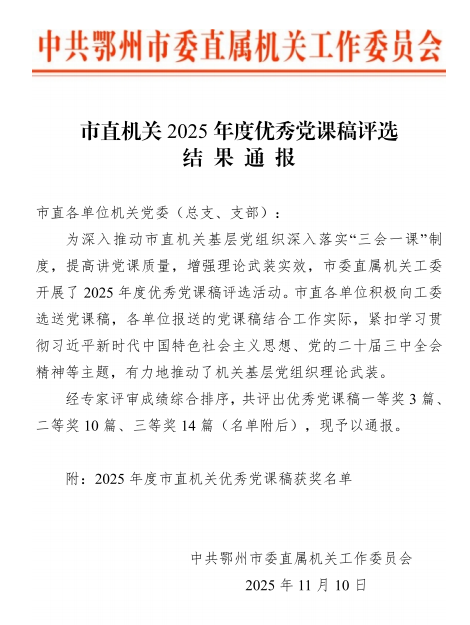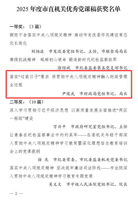 热烈祝贺,市财政局在市委直属机关工委2025年度优秀党课稿评选活动中,成功取得一等奖、三等奖各1名的好成绩!